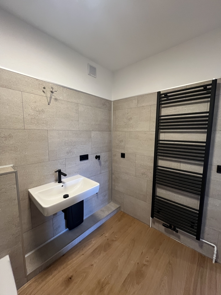 -Komplett renoviertes Badezimmer mit moderne Dusche mit edlem Rauchglas in dunkler Optik